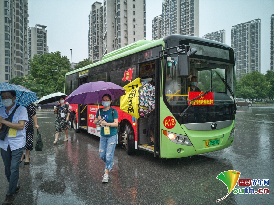 湖北一考点外,监考老师冒雨到达考点。中国青年网通讯员 童天 摄
