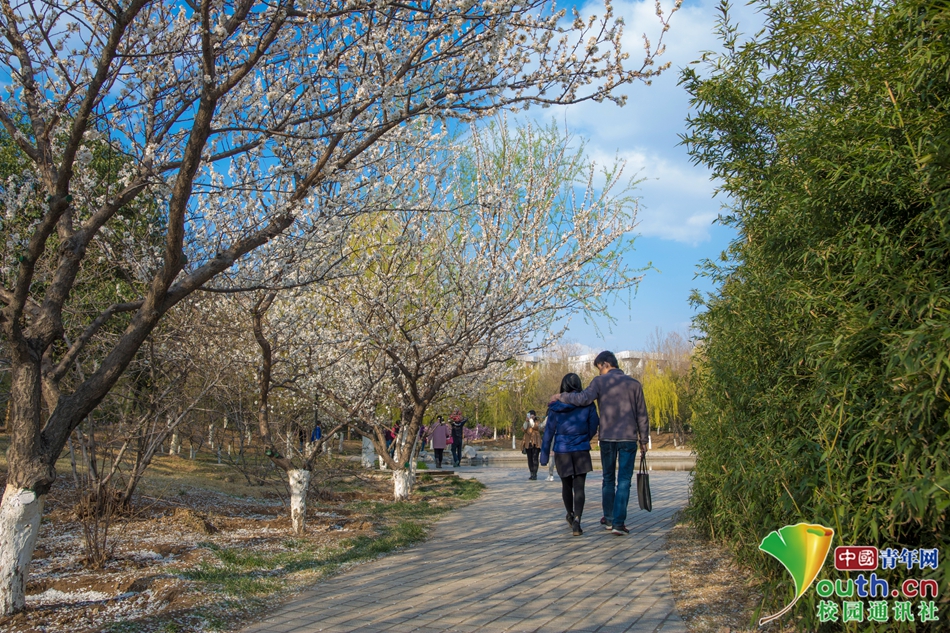 游人惬意地徜徉在山理工醉人的春色中,不经意间他们也融入到风景中去。中国青年网通讯员 刘子煜 摄