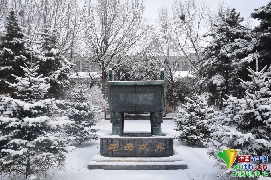 植霖楼前屹立的司母戊鼎,在与雪的结合下给人一种温文尔雅和稳重适度的感觉。中国青年网通讯员 庄海燕 摄