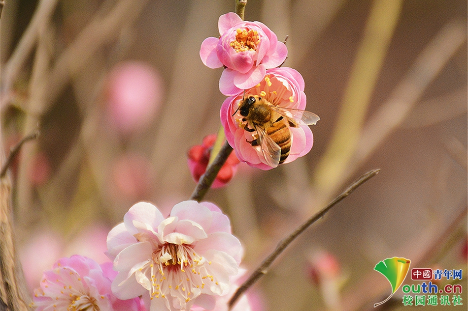 醉人的春风里飘散着醉人的花香,蓓蕾初放的鲜花用缱绻婀娜的花瓣拥抱劳动已久的蜜蜂,为其献上最娇嫩鲜美的花蕊,期待他日酿制的甘甜蜂蜜。中国青年网通讯员 徐孟耀 摄