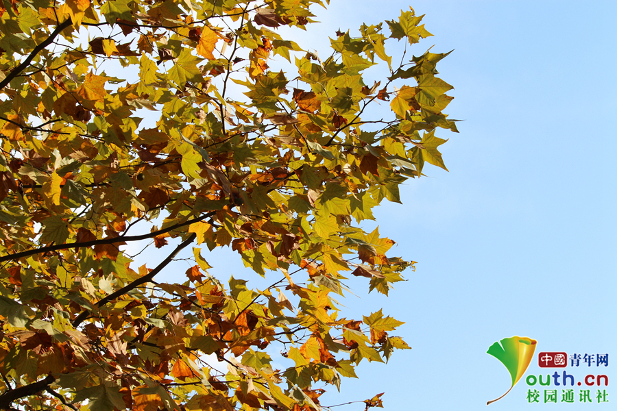 秋天的梧桐树叶与金灿灿的阳光相得益彰,在蓝天下明媚地站立在枝头。中国青年网通讯员 任曼玉 摄