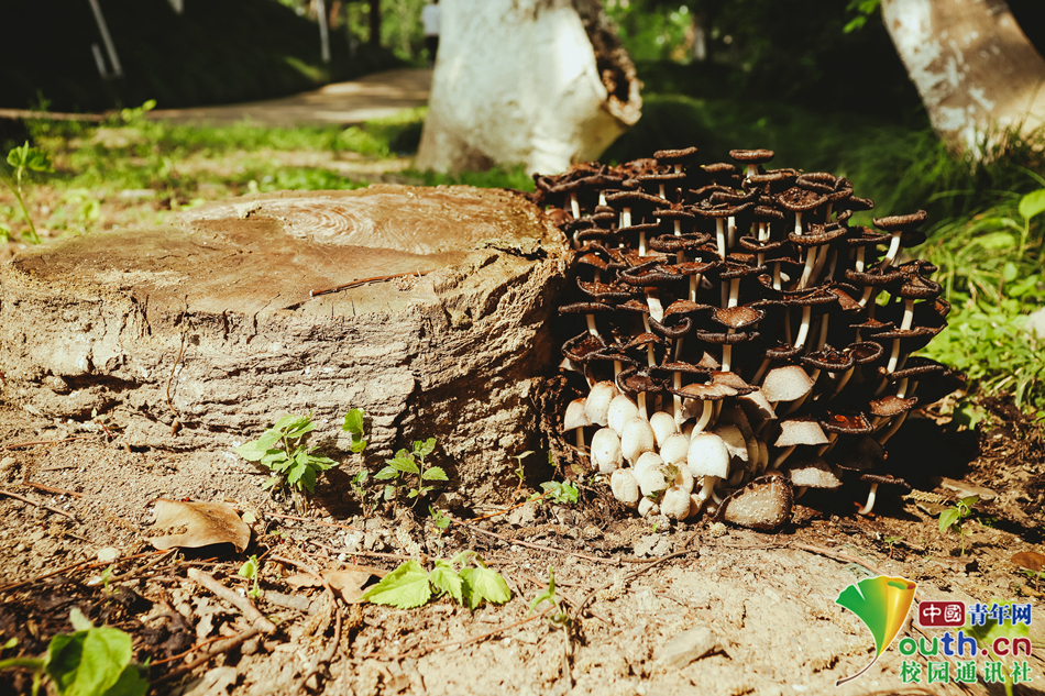 落日的幽微,年轮的转动,总能让你回忆人生的始末,倾听时光的故事。淡金色的夕阳映照着硕大的老树爬满年轮的树干,树干的身旁的野菌热烈盛放,依偎在老树身旁,听着老树讲九十载安徽师大的故事。中国青年网通讯员 王嘉慧 摄