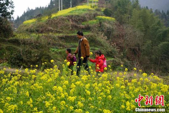 代课教师潘平忠在中午放学时,送年幼的学生回家。