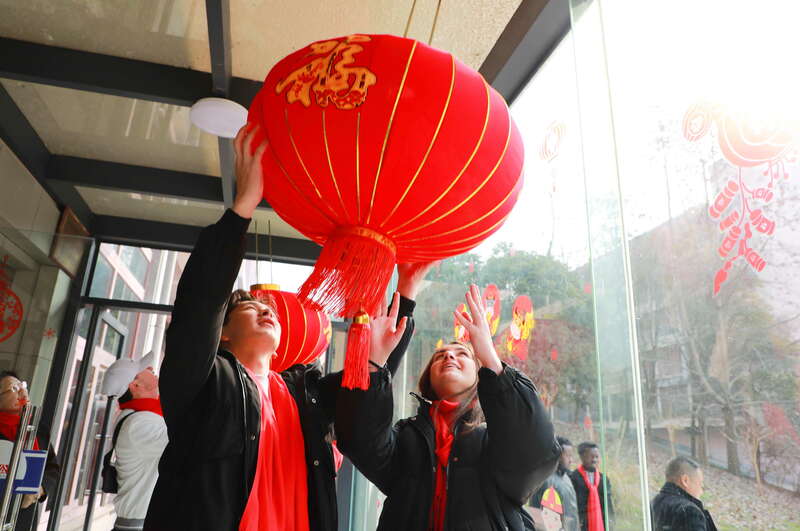 除了国内学生,今年浙江农林大学还有400多名留学生选择留校。挂灯笼、学唱新年快乐歌??为让这些海外学子在中国度过一个充实的春节,浙江农林大学还请来校外的书画家,与留学生们一起剪窗花、写对联、画国画。