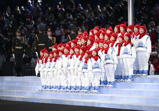 2月20日晚,北京第二十四届冬季奥林匹克运动会闭幕式在国家体育场举行。这是孩子们演唱奥林匹克会歌。新华社记者 鞠焕宗/摄