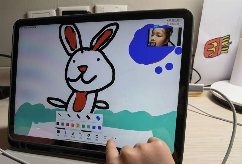 小雨跟同学共同作画,玩“你来画我来猜”的游戏。(受访者供图)