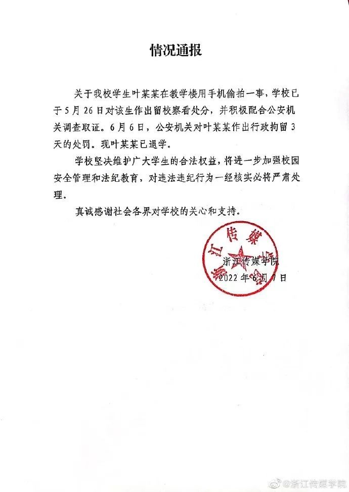 通报称,关于该校学生叶某某在教学楼用手机偷拍一事,学校已于5月26日对该生作出留校察看处分,并积极配合公安机关调查取证。6月6日,公安机关对叶某某作出行政拘留3天的处罚。现叶某某已退学。