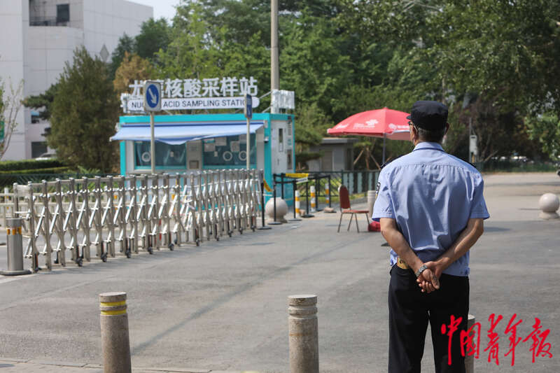 6月8日,北京市海淀区西苑饭店封控管控考点外,一名民警正在执勤。中青报·中青网记者 孔斯琪/摄