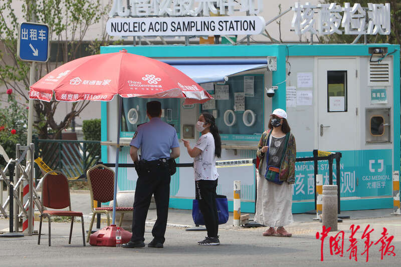 6月8日,北京市海淀区西苑饭店封控管控考点,两名市民向警察询问附近的核酸检测点是否开放。因西苑饭店被选为海淀区高考封控管控考点,这家位于西苑饭店门口的核酸检测点暂不对外开放,将于6月11日恢复开放。中青报·中青网记者 孔斯琪/摄
