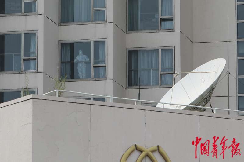 6月8日,北京市海淀区西苑饭店封控管控考点外,一名市民拍照记录特殊的考场。中青报·中青网记者 孔斯琪/摄
