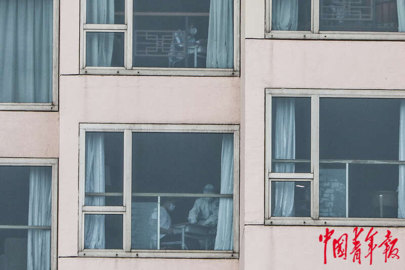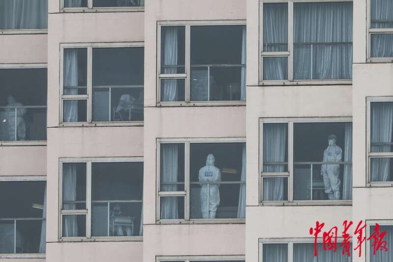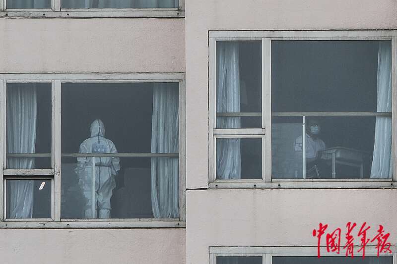 6月8日,北京市海淀区西苑饭店封控管控考点,2022年北京高考英语考试开始前,一名身穿防护服的监考老师为考生的房间开窗通风。中青报·中青网记者 孔斯琪/摄