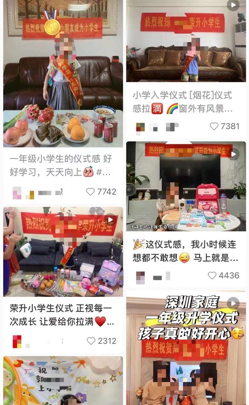 “热烈祝贺XXX同学荣升小学生”、“小学入学礼,给孩子满满的仪式感”……新学期开学了,社交平台上流行起一种特别的仪式,不少家长为孩子办一年级入学仪式。据中新社报道,仪式中,一条红色的大横幅、一条写有“好好学习、天天向上”的红色绶带通常必不可少。伴随着《欢送进行曲》等背景音乐,入学仪式开启一项项议程,如家庭成员挨个送礼物、送寄语等等。礼物也都有各自寓意,比如敲盆代表“一鼓作气”,大葱代表“聪明伶俐”,苹果代表“平平安安”,棒棒糖代表“越来越棒”等。