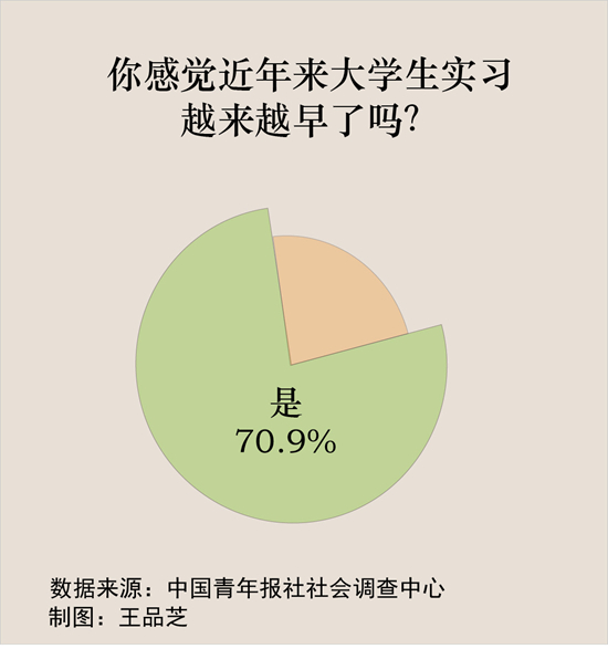 调查中,70.9%的受访大学生感觉近年来大学生实习越来越早了。