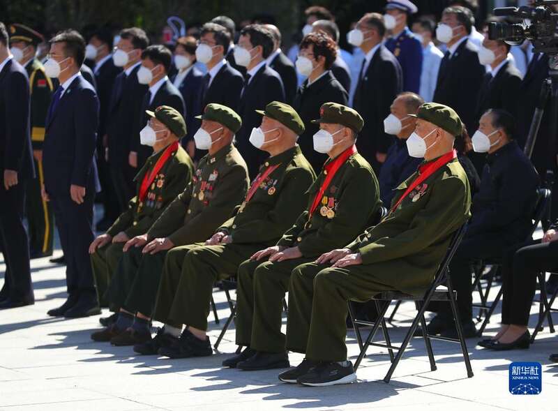 9月18日,参加过抗日战争的老战士代表在勿忘九一八撞钟鸣警仪式现场。新华社记者 杨青 摄