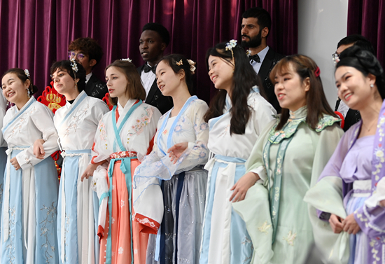 1月4日,在天津大学国际教育学院,留学生进行中文合唱的彩排。当日,天津大学国际教育学院的留学生为参加“校园春晚”加紧排练文艺节目。他们身穿汉服演唱中文歌曲,排练传统古典舞蹈等节目,感受中国传统文化的魅力。新华社记者 李然/摄