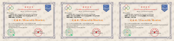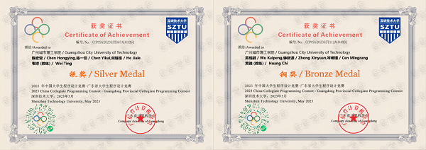 近日,广州城市理工学院收到了广东省大学生程序设计竞赛(GDCPC)暨中国大学生程序设计竞赛(CCPC)广东省赛区竞赛的获奖证书。今年的广东省大学生程序设计竞赛(GDCPC)在深圳技术大学举行,该校组织5队共15名学生参赛,最终韦婷老师指导的陈宏营、陈一恺、何镓乐同学组成的队伍喜获银奖,黄驰老师指导的吴楷鹏、钟新源、岑明壤组成的队伍获得铜奖,林煜东、陈雪松老师指导的三支队伍也获得优胜奖。这是我校首次在该项竞赛中取得银奖的突破。