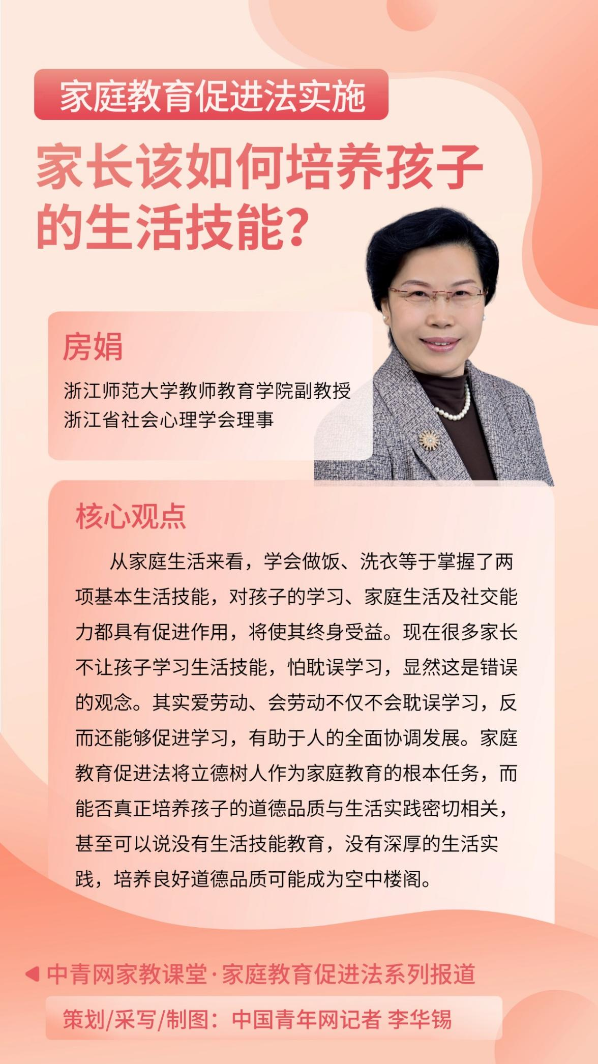 她表示,家庭教育促进法将立德树人作为家庭教育的根本任务,而能否真正培养孩子的道德品质与生活实践密切相关,甚至可以说没有生活技能教育,没有深厚的生活实践,培养良好道德品质就可能成为空中楼阁。只有家庭进行生活教育,学校进行知识教育,社会进行实践教育,三种教育相辅相成,这种结构完善而严谨的平衡教育才能为培养出真正的人才奠定坚实基础。