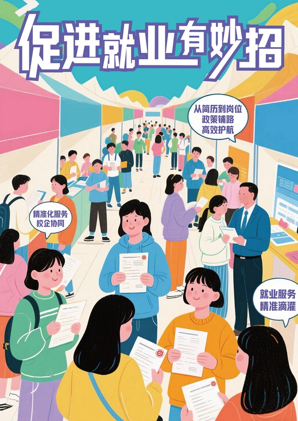 作品简介:《促进就业有妙招》系列海报以就业全流程为叙事逻辑,用鲜明色彩、生动人物与场景图形,呈现校企合作、招聘会服务、鼓励学生迈出校园、职业发展等环节。借温暖色调与互动形象,消解焦虑,传递积极情感,实现视觉与传播统一,助力理解政策、激发信心,营造共促就业氛围。