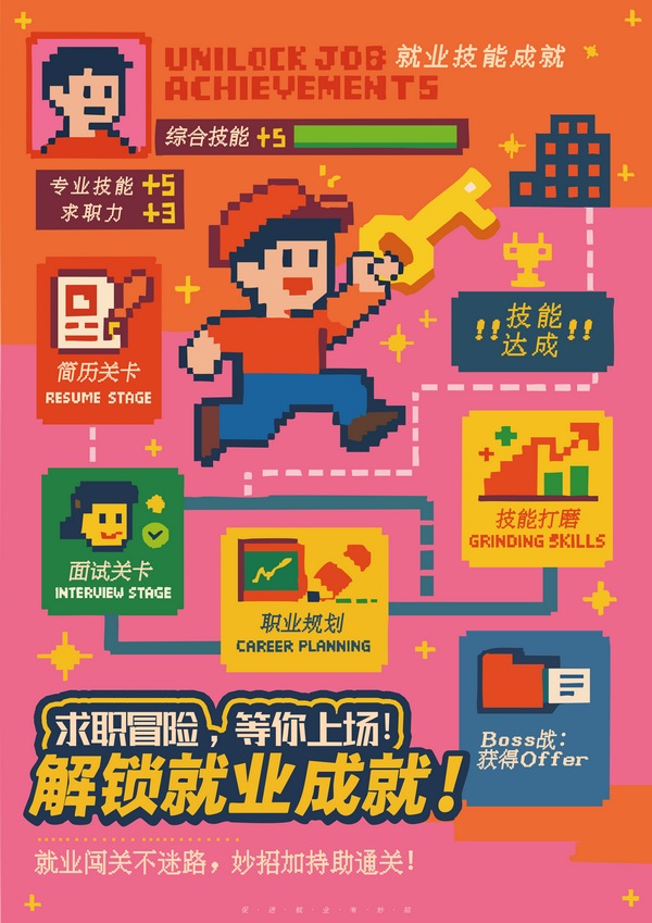 作品简介:本海报以像素风格构建“游戏化求职流程”视觉叙事,借助游戏通关的概念展现高校助力系统对毕业生求职路径的支持与引导。画面主角手持金钥匙奔向成功关卡,象征“掌握技能,解锁理想岗位”。各阶段以“简历关卡”“面试关卡”“技能打磨”等形式表现,强化就业旅程的系统性与成就感。