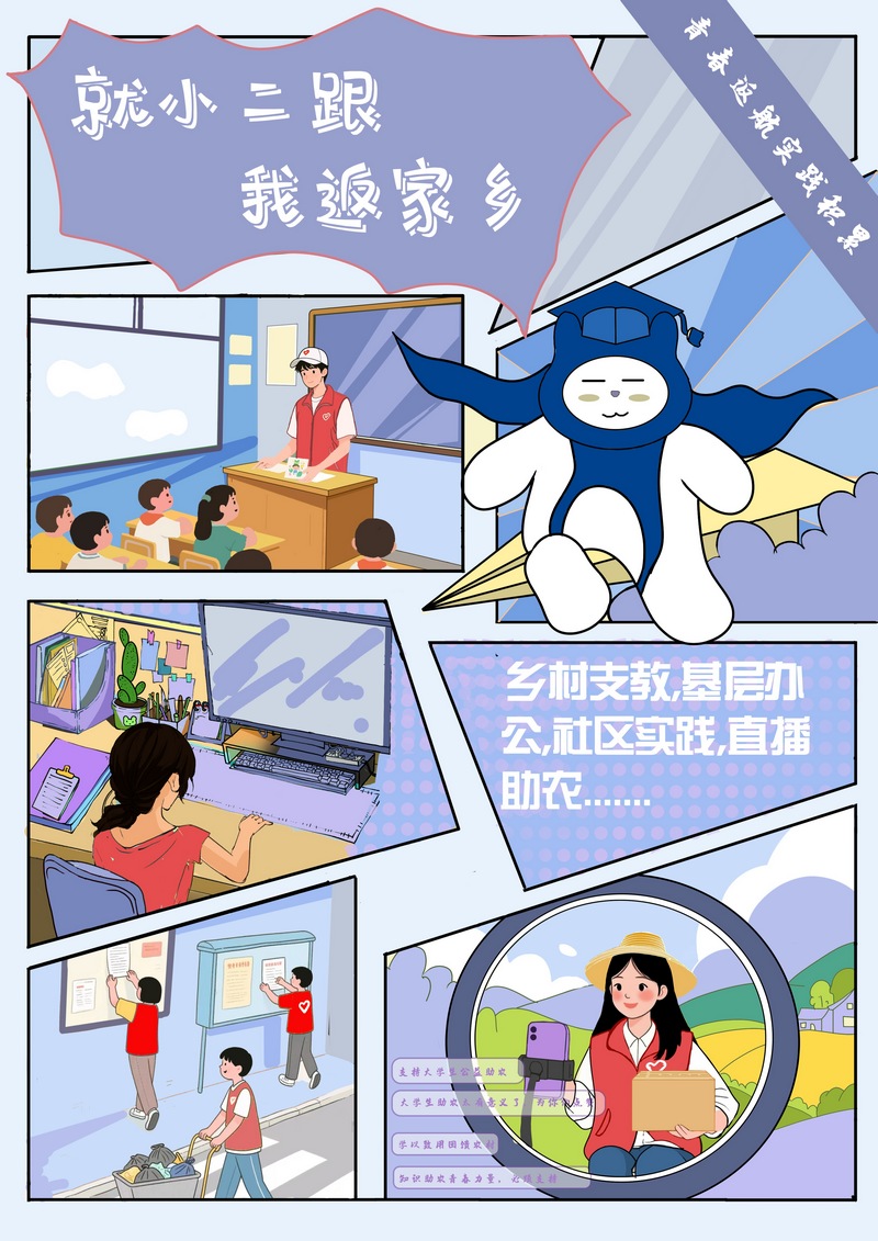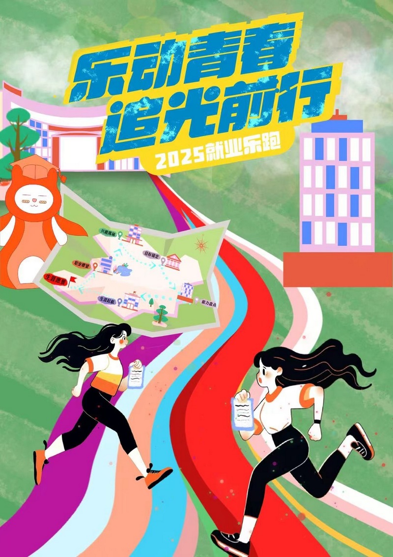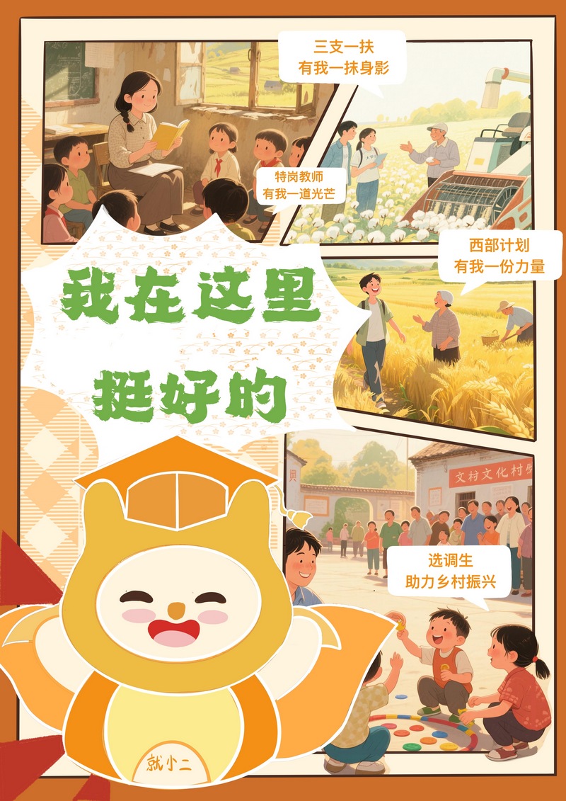 作品简介:本系列海报共4张,均围绕洛阳理工学院就业指导IP形象“就小二”创作,以分镜头叠加的多元场景凸现积极就业、小我融入大我的正向价值观和成才观,以动感的画面、多变的色彩和富有张力的形象透射出理想的光辉与青春的活力,传导阳光的心态、行动的力量和必胜的信心。