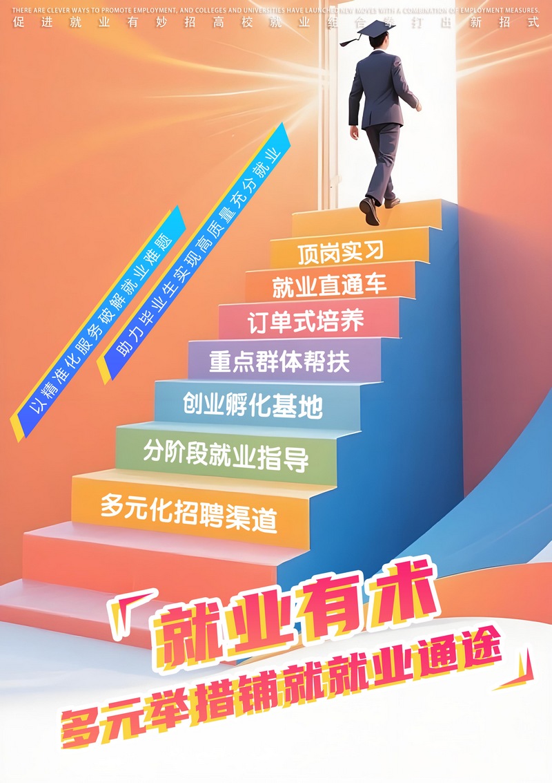 作品简介:高校就业创新海报以向上阶梯为视觉载体,串联“多元化招聘渠道”“分阶段就业指导”“创业孵化基地”等多元举措,传递“就业有术,多元举措铺就就业通途”理念。借精准化服务,贯通求职全流程,为毕业生架起从校园到职场的成长阶梯,助力破解就业难题,推动实现高质量充分就业,尽显高校促就业的系统性、创新力与坚定决心。