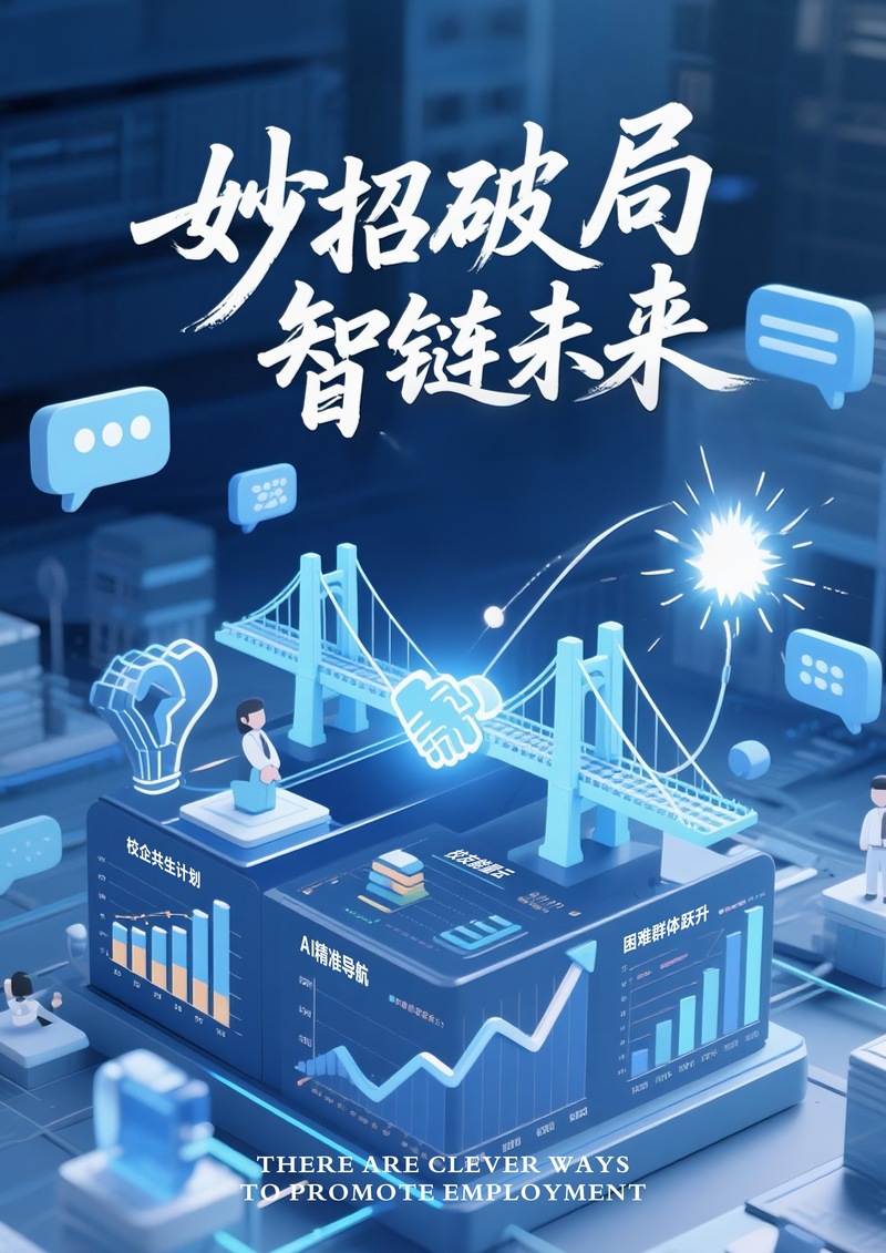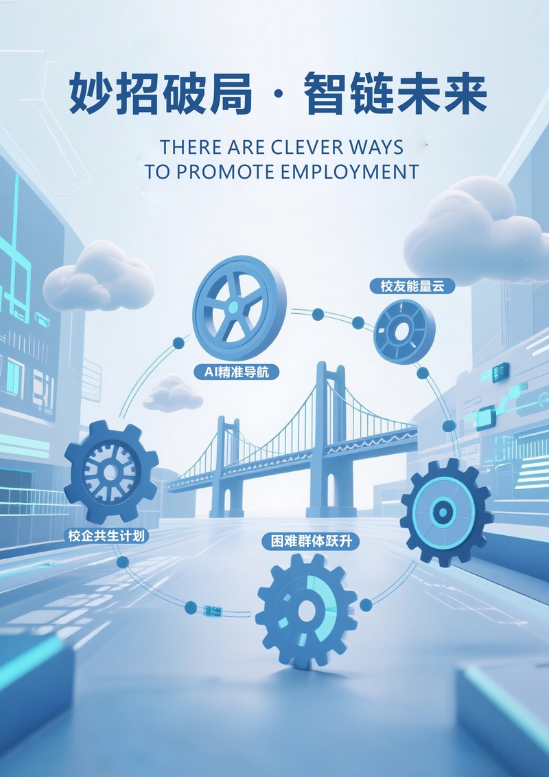 作品简介:“妙招破局 智链未来”,解码高校就业服务新范式。图一以“握手”为引,巧妙串联校企合作、AI智能精准导航、校友云系统与困难群体帮扶提升计划,将多维度就业举措拧成合力,化作点亮毕业生未来的明灯;图二则借“齿轮”为纽带,让校企合作、AI精准导航、校友云系统和困难群体帮扶提升四大就业支撑体系环环相扣、高效运转,为学子搭建起从校园到职场的坚实桥梁,全程护航求职择业路。