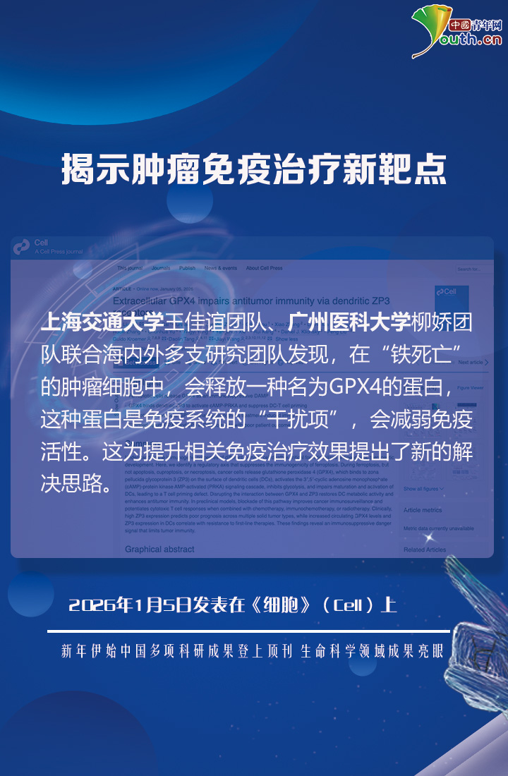 中国青年网北京1月7日电(记者 王龙龙 姜宁)自2026年1月1日至5日,中国科学院杭州医学研究所、北京大学、西湖大学、上海交通大学、广州医科大学等多所高校和科研机构的科研团队在《科学》《细胞》等国际顶刊上刊发多篇论文。