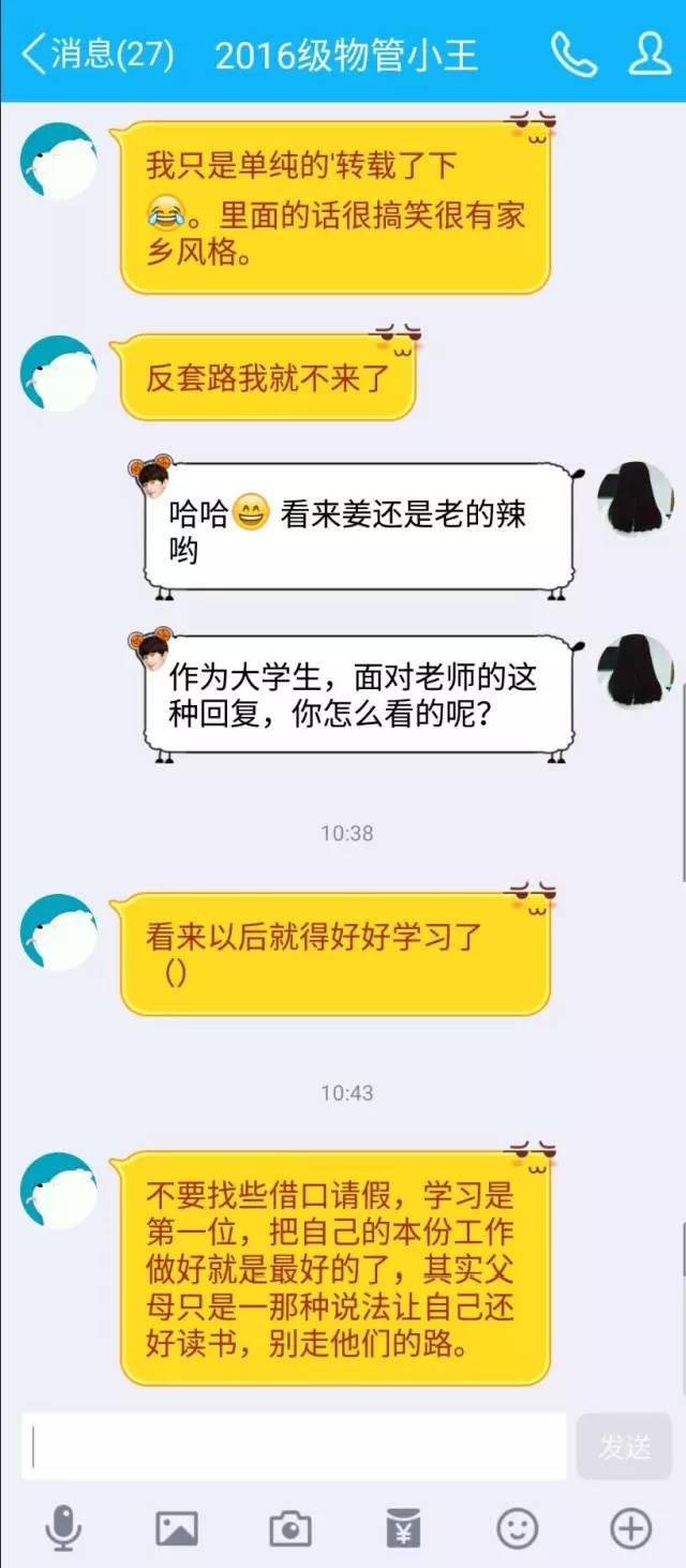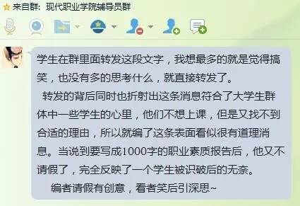 辅导员说,学生在群里转发文字,也觉得搞笑,没多思考就直接转发了。但是她认为,转发的背后也折射了大学生的心理,不想上课又找不到合适的理由,就编了看似很有道理的消息,这背后的原因值得深思。