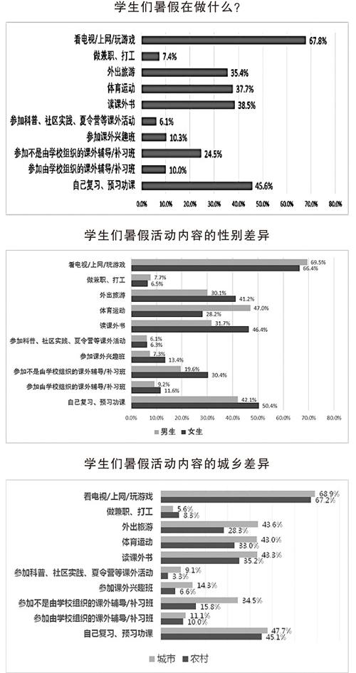 调查显示,初中生们的暑假生活主要包括三个方面的内容:文体娱乐、学习提高以及社会实践和集体活动。其中文体娱乐活动的比重最大,看电视、上网、打游戏是最普遍的娱乐活动,有超过三分之二的初中生们将其作为度过暑假生活的重要内容。另外读课外书、体育活动、外出旅游这三项文体活动的比重也很大,都有超过三分之一的初中生把它们作为暑期文体活动的主要方式。学习在初中生们的暑假生活中所占的比例也非常大,最多的情况是学生们在家自己复习和预习功课,参加课外辅导班和补习班的比例也很高,暑期参加由社会力量办的课外辅导班或补习班的初中生超过了四分之一,尽管教育主管部门严令禁止学校组织课外辅导班和补习班,但也有十分之一的初中生报告说他们参加了学校组织的辅导班或补习班;除了课业学习以外,初中生及他们的家长们对于多方面综合知识和能力的提高也比较重视,有超过十分之一的初中生们暑假期间参加了与课业无关的兴趣班的学习。相对于文体娱乐和学习提高,初中生们的暑假生活中社会实践与集体活动所占的比重则相对偏低,只有7.4%的初中生们在暑假从事了兼职或打工。诚然,年龄可能是这个现象的主要原因,但初中生们在暑假参加科普、社区实践、夏令营等活动的比例也只有6.1%。调查结果很明确的显示,相比于文体娱乐和学习提高,社会实践与集体活动在初中生们的暑假生活中所占的比重相对不足。