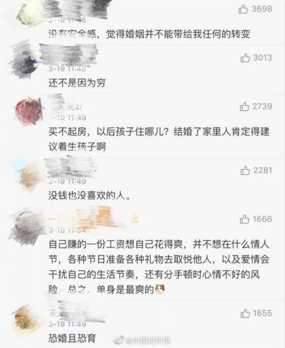 相比小苋这种“挑剔”青年,还有一种是从没谈过恋爱的“母胎单身”。据民政部的数据显示:2018年中国单身成年人口已经超过2亿,独居成年人口超过7700万。记者发现身边就不少,别提结婚了,可能恋爱还没谈过。玮酱今年29岁,恋爱经历为0,单身久了,完全习惯了一个人的节奏,反而不想身边多一个人了。她用网络上流行的一句话回复记者:“是手机不好玩,还是电视剧不好看?我为什么要谈恋爱?”,虽然有戏谑成分,但也反映出当代年轻人的婚姻观。
