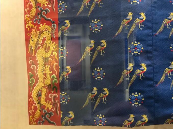 在南京江南丝绸文化博物馆,该馆以非遗工艺1:1再现了这件礼服的原貌。翟纹及小轮花图案部分均以苏州宋锦工艺完成,并以盘金绣工艺还原了服饰的领子、袖口、衣襟处金色龙纹的华丽端庄。