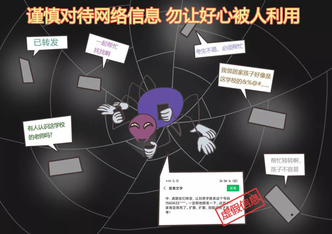 2019年高考开考前夕,微信群、朋友圈等网络平台流传着一则虚假信息,声称“捡到一张高考准考证,刘思宇,考点在实验高中,请朋友们转发,让刘思宇联系这个号码1560633****。一定帮他群发一下,这孩子一家肯定急死了。扩散,扩散,别耽误孩子高考!”从2016年“白娅倩”、2017的“杨雷雷”“孙超”“党喜龙”、2018年“刘明炜”“刘明婷”等同学到2019年的“刘思宇”,年年丢失准考证,内容如出一辙,套路依旧。
