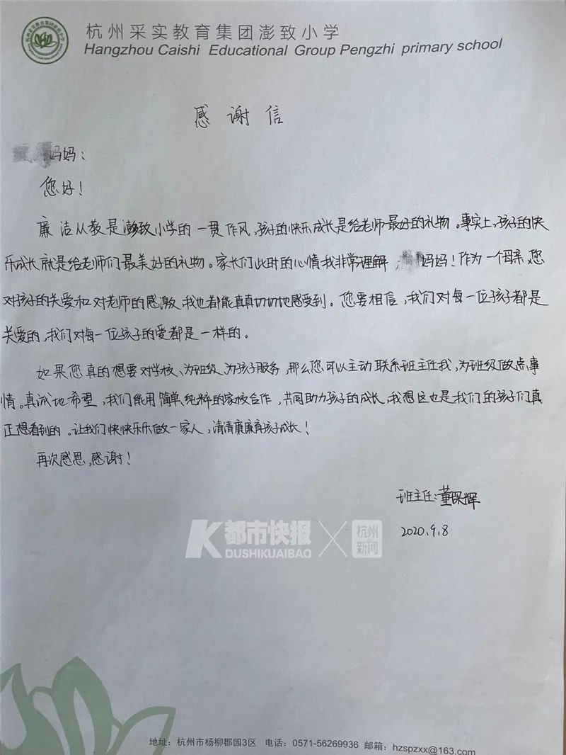 董老师的感谢信。 都市快报 图