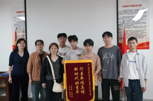 “是的,就是这几位好心的同学。”5月25日,胡东红女士和她的丈夫带着一面“行善举传真情,新时代好青年”的锦旗来到江西机电职业技术学院,当面感谢电气工程学院2020级五年机电班的吴宇航、严斌、彭旭、龙旭四位同学。