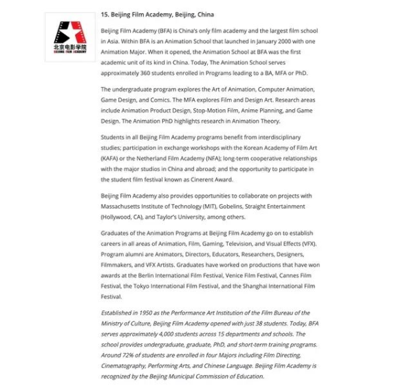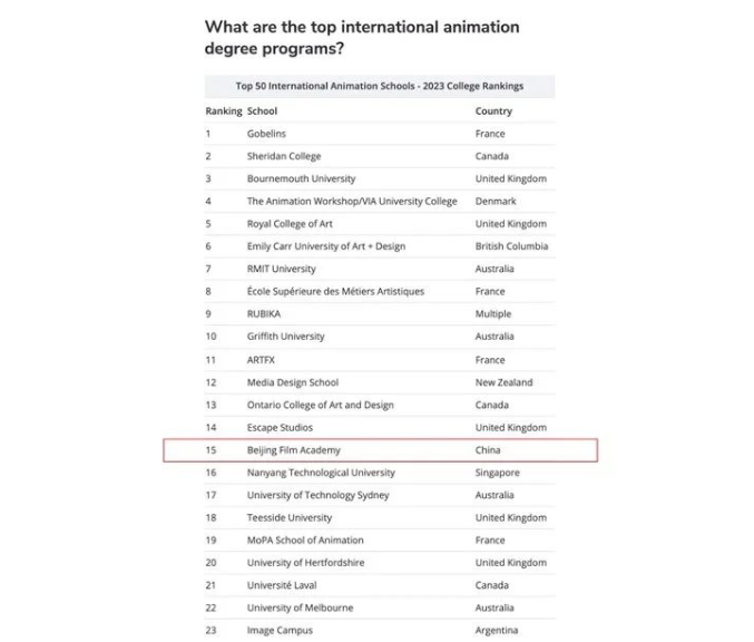 近日,Animation Career Review(AMC STUFF)美国动画职业评论官方发布了2023年国际动画院校前25位排名(排除美国院校),北京电影学院上升2位,晋级至第15名。至此,北京电影学院排名三年中持续晋升,稳居中国高校动画教育的最高排名。
