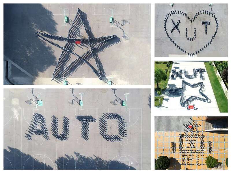 在辅导员老师和教官的指导下,每个连队的同学们发挥想象力,通过列队组成各种代表学校、院系或自己连队名称的字母和图案,学校用航拍机一一记录下来。