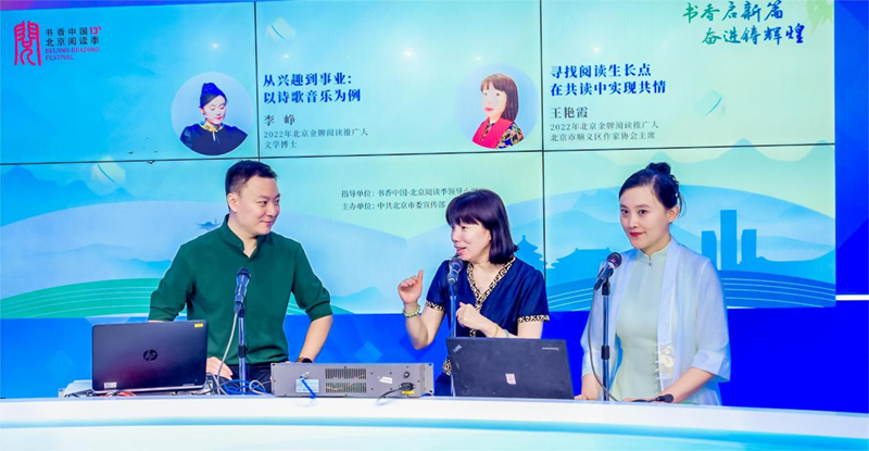 北京广播电视台主持人李锐(左一)和王艳霞(中)、李峥(右一)在“阅读推广方式的创新与实践”主题阅读分享现场