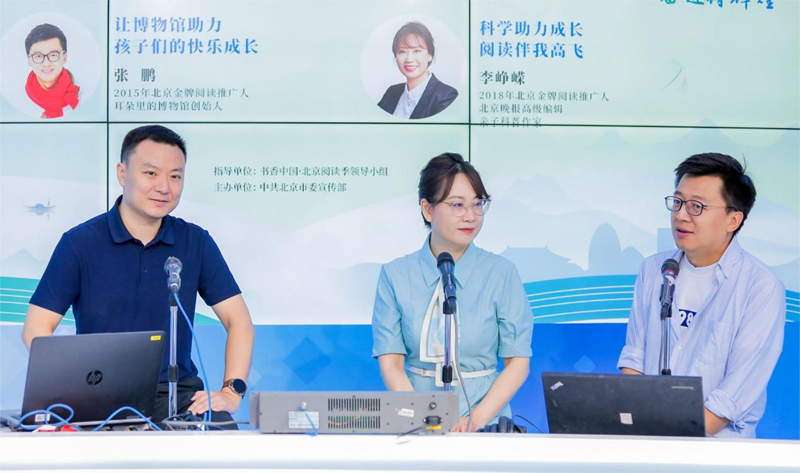 北京广播电视台主持人李锐(左一)和李峥嵘(中)、张鹏(右一)在“阅读推广助力青少年传承城市记忆”主题阅读分享现场