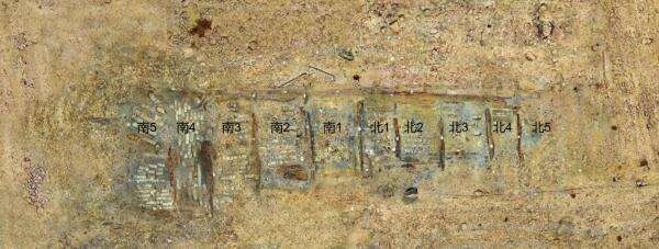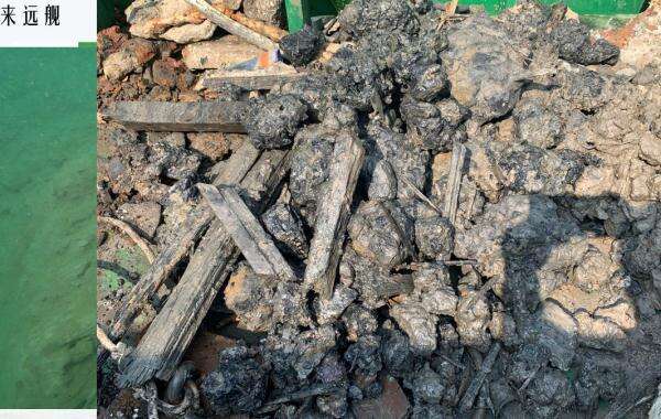 一号沉船遗址由核心区、环形散落区和条形散落区组成,年代为明正德年间。核心区为船体和大量堆叠有序、码放整齐的陶瓷器、铁器等构成的堆积,长约37米,宽约11米,环形散落区、条形散落区由散落的船载物品构成,遗物较少。一号沉船上部结构不存,残存船体大部分被掩埋覆盖,仅在部分位置暴露有隔舱板和底板。