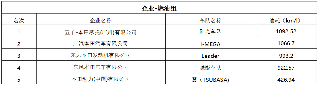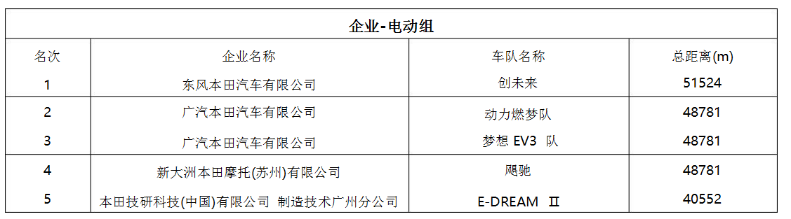 在两天的比赛中,共有来自全国各大高校、Honda 关联企业的近 60 支车队,在燃油车和电动车的两个级别四个组别中进行了激烈角逐。最终燃油车级别的桂冠由吉林大学肯赛节能车队和五羊-本田摩托(广州)有限公司阳光车队,电动车级别桂冠由北京理工大学翼N 2 队和东风本田汽车有限公司创未来车队斩获。