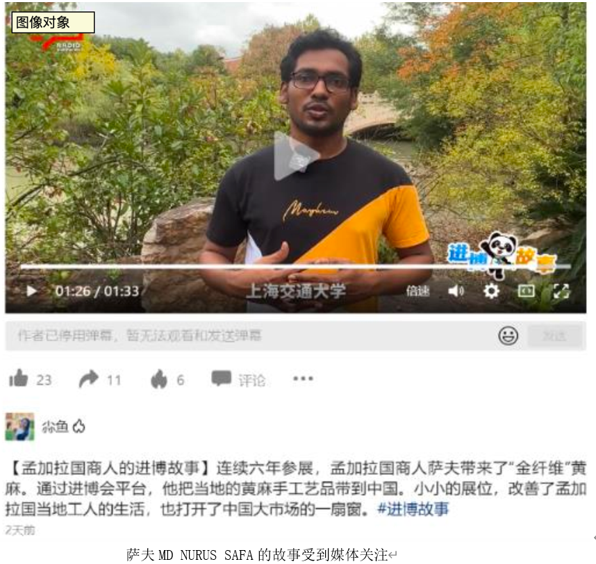 2018年至今,他6次参加中国国际进口博览会,利用中国商业平台向中国和全球各地成功出口了许多黄麻手工艺品,同时将中国现代与传统的各类产品引入孟加拉国。