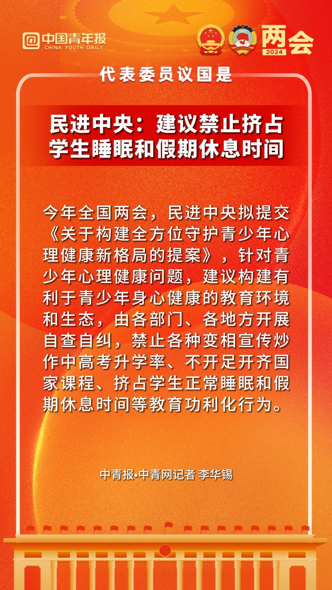 中国青年报客户端北京2月27日电(中青报·中青网记者 李华锡)今年全国两会,民进中央拟提交《关于构建全方位守护青少年心理健康新格局的提案》,针对青少年心理健康问题,建议构建有利于青少年身心健康的教育环境和生态,由各部门、各地方开展自查自纠,禁止各种变相宣传炒作中高考升学率、不开足开齐国家课程、挤占学生正常睡眠和假期休息时间等教育功利化行为。
