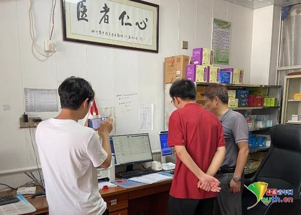 团队成员在老屋下村村卫生室了解电子健康档案系统。团队供图