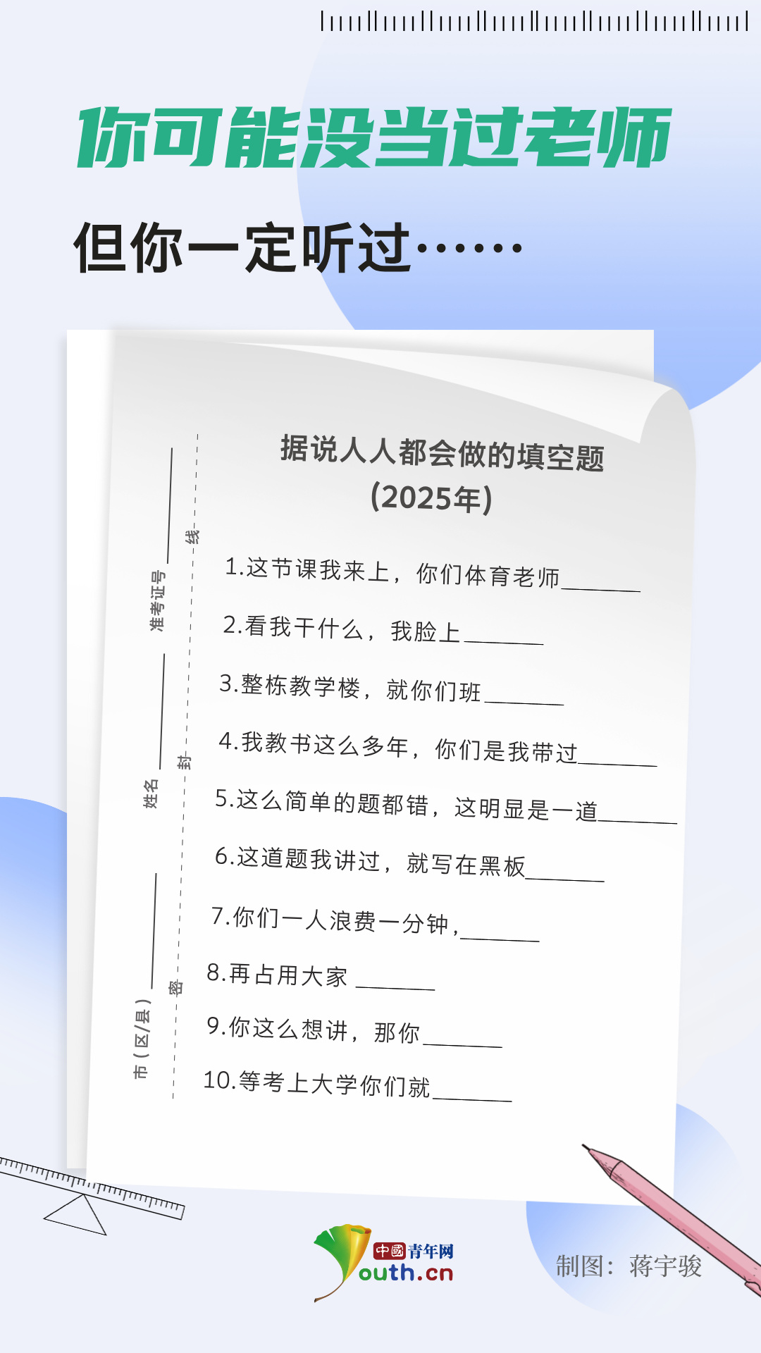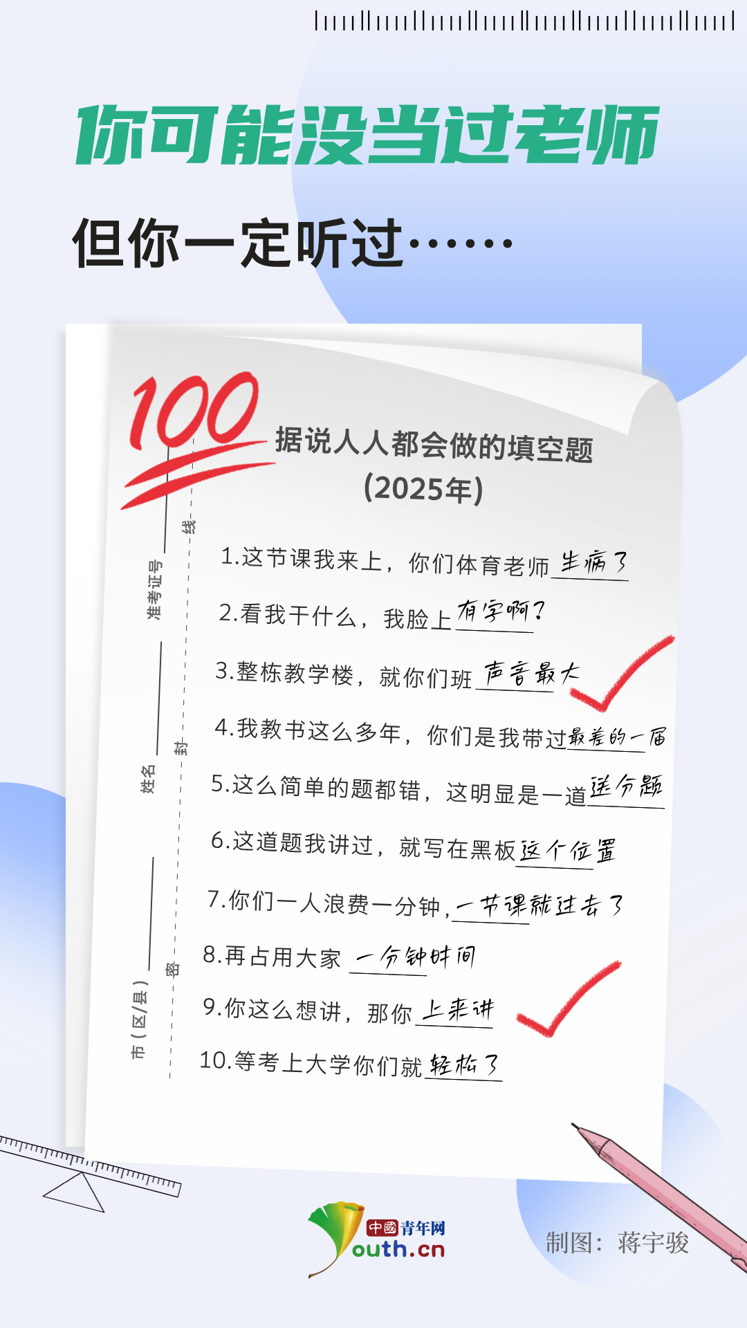 中国青年网北京9月9日电(记者 蒋宇骏)“这明显就是一道_____”“你们是我带过_____”……你可能没当过老师,但一定听过这些熟悉的口头禅,这里面满是老师对学生的关爱。教师节来临之际,记者整理了10道来自老师口头禅的填空题,以此青春回忆向广大教师致敬!下面,看看你能答出几道。