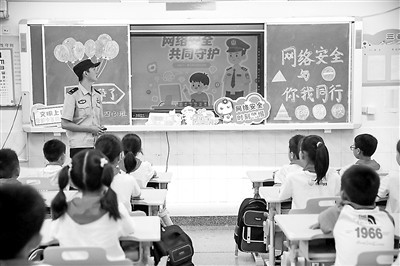 在江苏省如皋市磨头镇磨头小学“护苗·网络安全课”上,民警向学生宣传普及网络安全知识。徐慧 摄