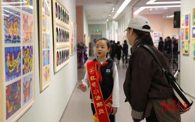 10月22日,北京炎黄艺术馆,朝阳区实验小学的红领巾讲解员给观众介绍该校学生的绘画作品。中青报·中青网记者 陈剑/摄