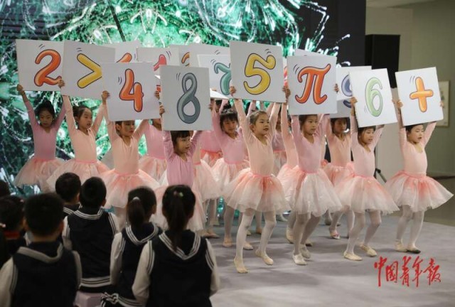 10月22日,北京炎黄艺术馆,同学们在舞蹈中用牌子展示数学符号。中青报·中青网记者 陈剑/摄