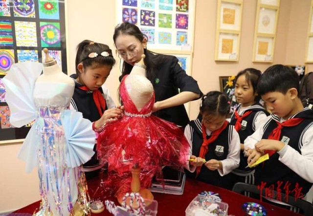 10月22日,北京炎黄艺术馆,朝阳区实验小学的同学们在后台,准备上场进行创意服装秀的展示。当日,一场融合艺术、科技等跨学科主题研究——STEAM教育课堂教学展示,在这里进行,美育成果展也同时在这里开幕。据介绍,本次展览汇集了该校各校区学生的1000余幅作品,涵盖水墨、水彩、版画、综合材料、数字艺术等多种形式,展示相关课程改革成果。中青报·中青网记者 陈剑/摄