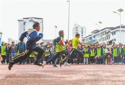 湖南省永州市道县第四小学学生在参加跑步比赛。