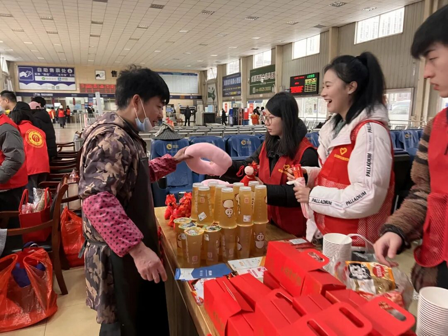图为实践队员在城东客运中心给旅客发放暖心礼包。曾景灿 供图
